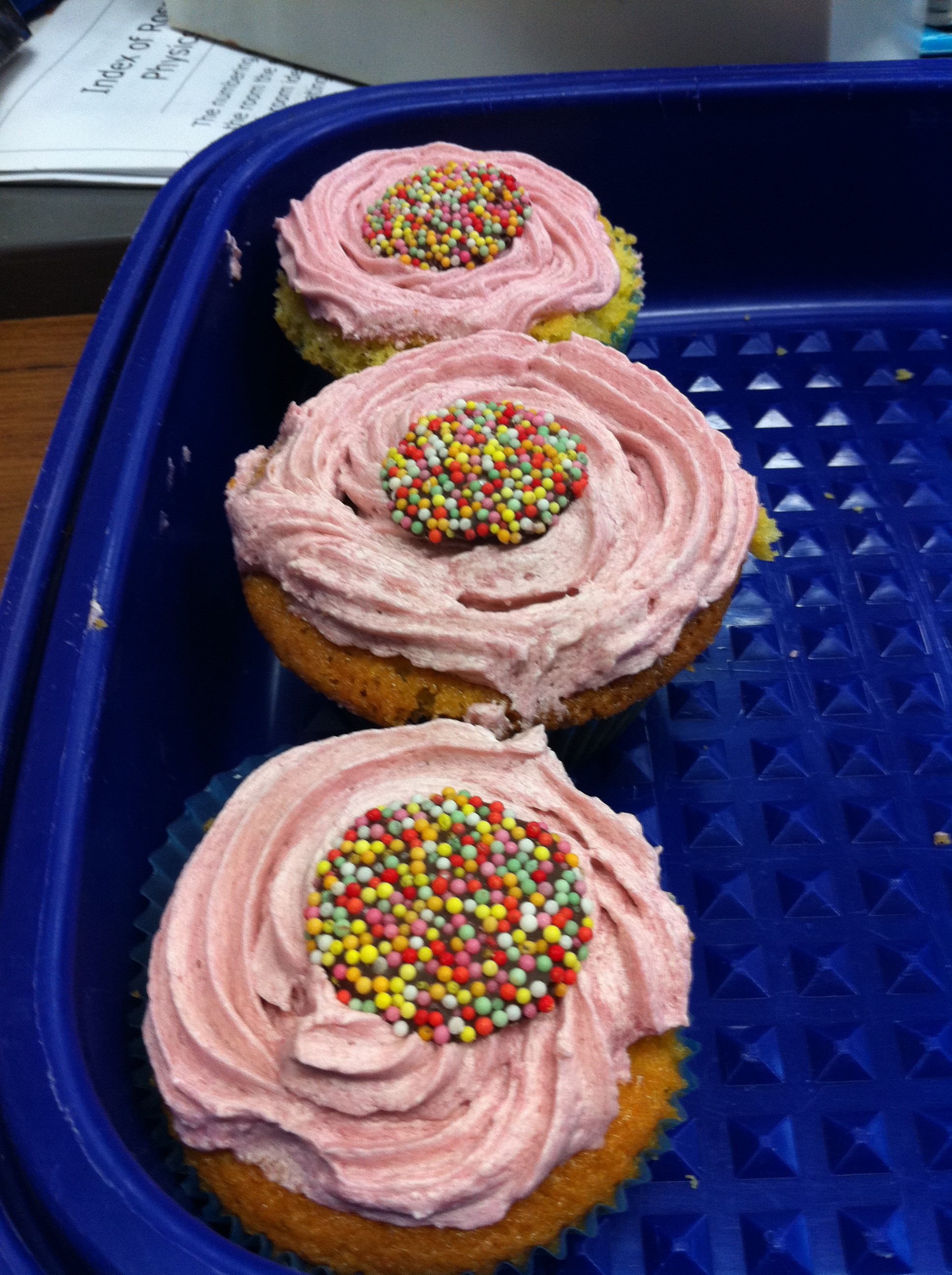 As it is tradition to bring something in to work on your birthday, I spent Sunday afternoon baking. I baked 36 cupcakes. With my late start on Monday morning, my friend Kat came over to help me ice all the cupcakes before heading to work. So my colleagues who work in the same area as I do, and my Computer Science students all got to enjoy vanilla cupcakes with pink icing, topped with a chocolate freckle.