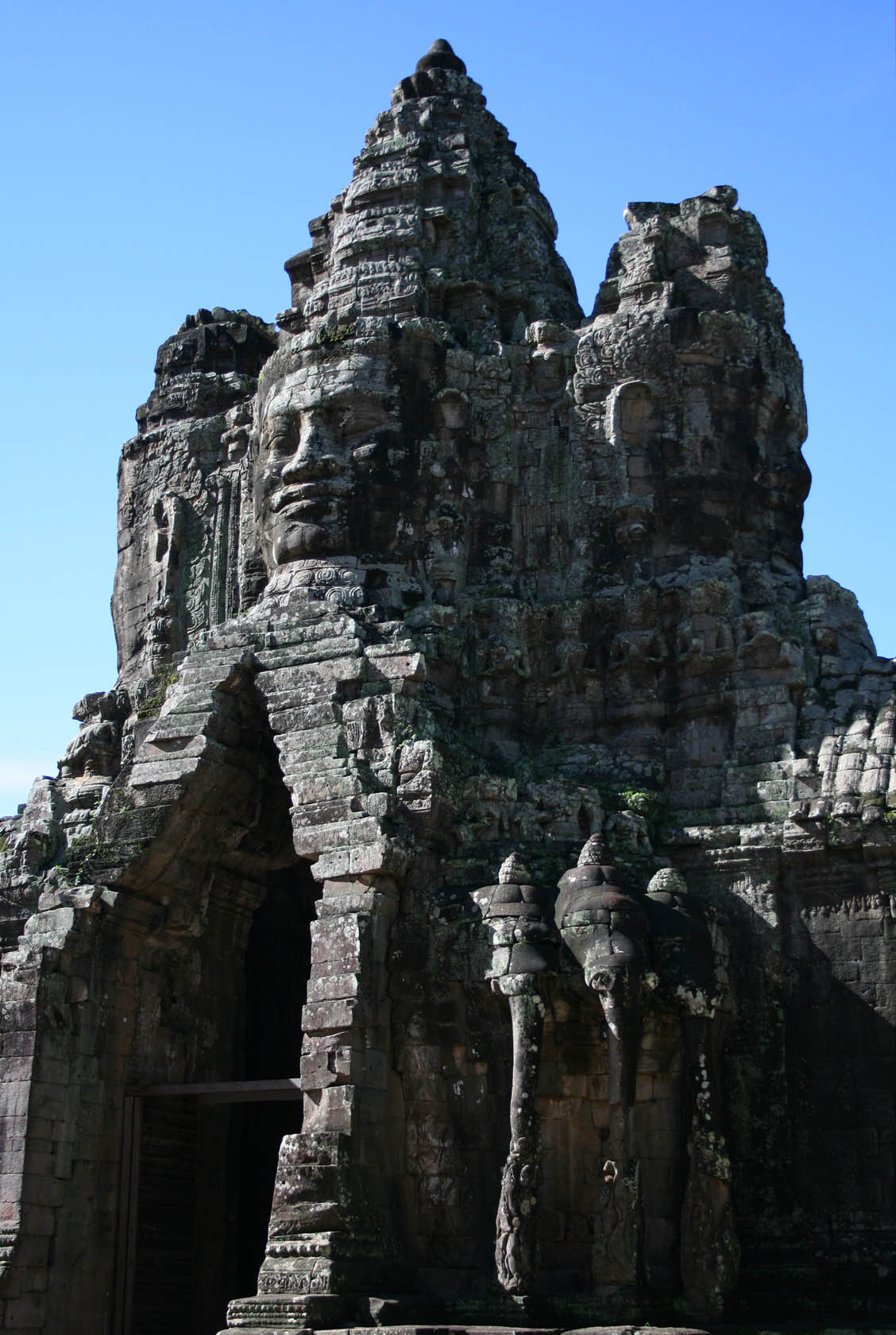 Once in the centre-ish of the ancient city there are a number of amazing structures including: Bayon Temple, Baphoun Temple, Phimeanakas temple, the terrace of the elephants and the terrace of the leper king. Everything is constructed from volcanic rock and sandstone. The foundations are typically made from volcanic rock as it is very hard, on top of the foundations, all the walls roofs, etc are made of the sandstone. Being a softer stone the sandstone was used so that they were able to carve their decorations into it. Many of the carvings illustrate buddhist or hindu beliefs (depending on which temple you are in), some illustrate historical events, and some have sanskrit, the old writing which no one can read any more. On many of the sandstone blocks there were 2 holes. The sandstone blocks all came from Kulen mountain, they were transported down the river, and then for the last section they were dragged by elephants. Two sticks were put in each block, and this somehow provided the means for the elephant to drag it. I would try to describe the buildings, but I think that words can’t really describe the amazing and intricate designs, so you will have to look at the photos.